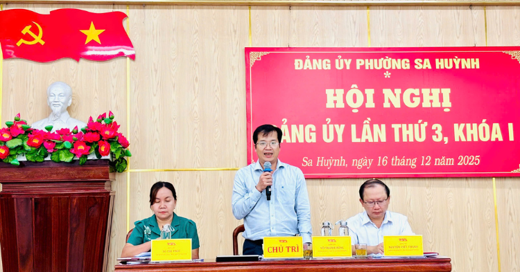Sáng ngày 16/12/2025, Đảng ủy phường Sa Huỳnh tổ chức Hội nghị lần thứ 3, khóa I, nhiệm kỳ 2025 – 2030 để đánh giá tình hình thực hiện nhiệm vụ năm 2025; đề ra mục tiêu, chỉ tiêu, nhiệm vụ và giải pháp năm 2026 và tiến hành một số nội dung quan trọng khác. Đồng chí Võ Thanh Hùng, Bí thư Đảng ủy, Chủ tịch HĐND phường; đồng chí Tô Thị Trúc, Phó Bí thư Thường trực Đảng ủy và đồng chí Nguyễn Viết Thanh, Phó Bí thư Đảng ủy, Chủ tịch UBND phường đồng chủ trì hội nghị.