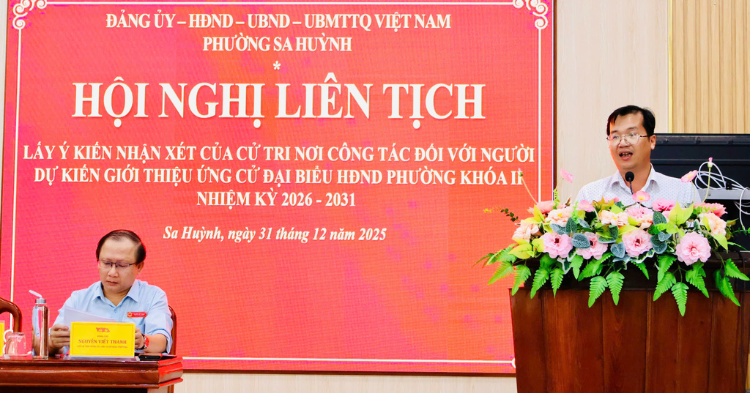 Chiều ngày 31/12/2025, Thường trực Đảng ủy phường Sa Huỳnh tổ chức Hội nghị liên tịch lấy ý kiến cử tri nơi công tác đối với những người ứng cử đại biểu HĐND phường khóa II, nhiệm kỳ 2026 – 2031, hiện đang công tác tại Đảng ủy phường, Thường trực HĐND phường, các Ban HĐND phường, UBND phường, các cơ quan chuyên môn thuộc UBND phường, Ủy ban MTTQ Việt Nam phường và các tổ chức chính trị – xã hội phường. Hội nghị do các đồng chí: Võ Thanh Hùng, Bí thư Đảng ủy, Chủ tịch HĐND phường; Tô Thị Trúc, Phó Bí thư Thường trực Đảng ủy phường; Nguyễn Viết Thanh, Chủ tịch UBND phường đồng chủ trì. Tham dự Hội nghị có các đồng chí Thường trực Đảng ủy, Thường trực HĐND phường; lãnh đạo UBND phường; Ban Thường trực Ủy ban MTTQ Việt Nam phường; lãnh đạo, công chức các cơ quan tham mưu, giúp việc Đảng ủy; lãnh đạo, công chức, viên chức các cơ quan, đơn vị chuyên môn thuộc UBND phường và công chức Cơ quan Ủy ban MTTQ Việt Nam phường.